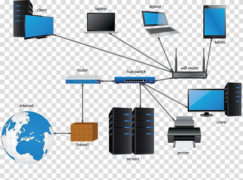 Networks can be wired (Ethernet cables) or wireless (Wi-Fi).